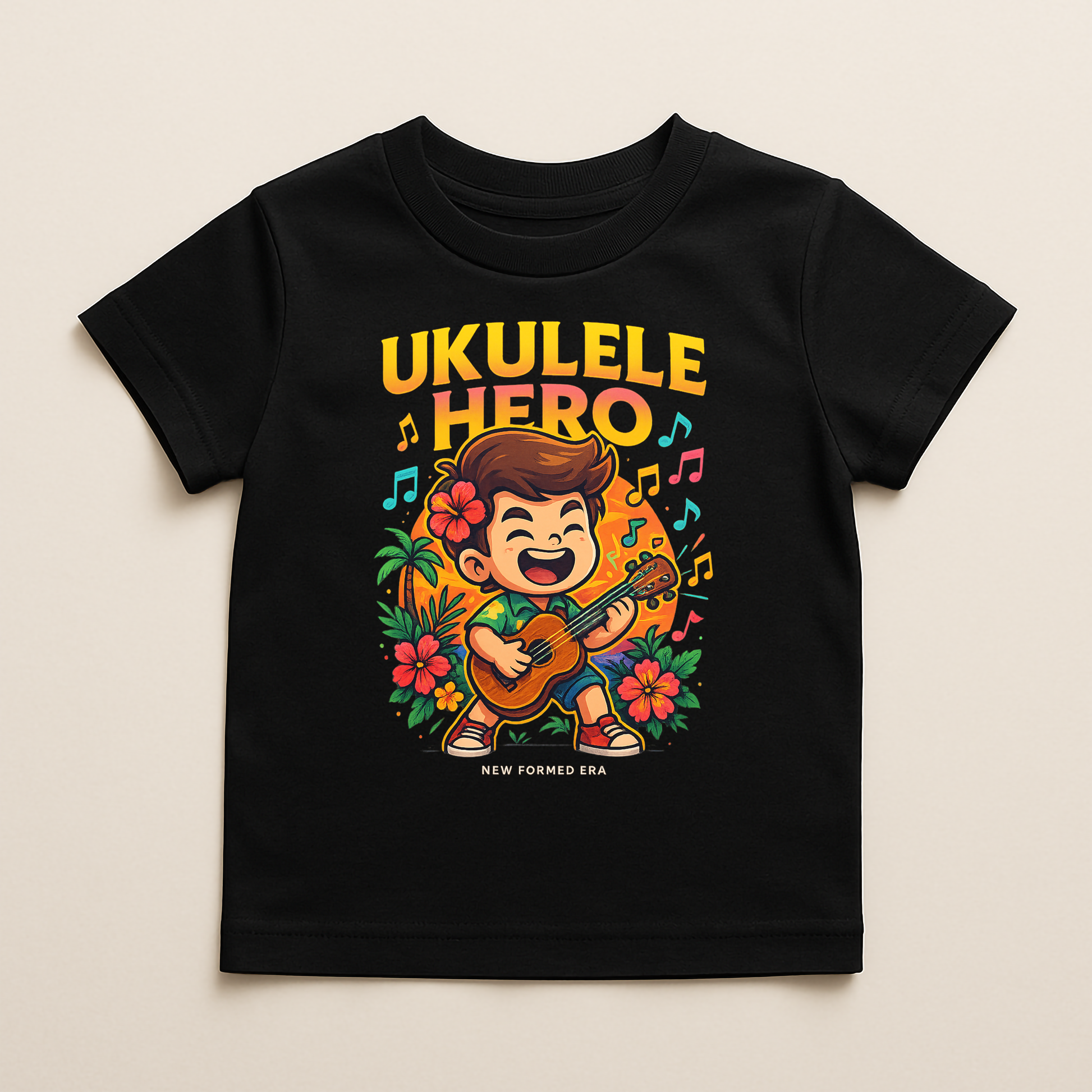 Strike a chord with the “Ukulele Hero” toddler tee—featuring a cheerful cartoon kid rocking out on a ukulele while bright musical notes fly into the air. Fun, colorful, and full of rhythm, this playful design celebrates music, creativity, and big imagination in little rockstars.